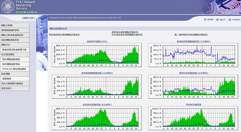 提供本校對外網路流量及頻寬相關資訊,及東海網路服務的相關連結,如:對外頻寬使用狀況、宿舍網路連線狀況、網路速度測試網站連結、校內各建物網路主幹連線狀況。