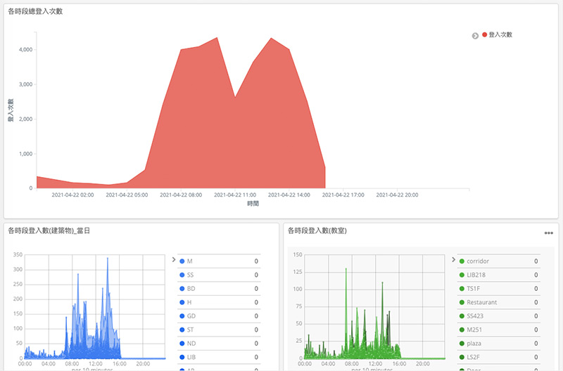 WiFi log分析平台提供多樣化圖表及地圖供校內師生參考,資料來源為校內各無線網路基地台的系統日誌資料,呈現資訊均為認證成功登入的WiFi使用者,本系統分別提供了15分鐘內、當日及前七日之圖表分類。快來一起看看哪個地區、哪個時段最多人在使用WiFi吧!