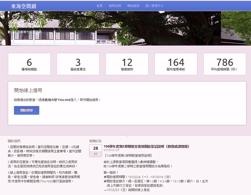 本校於106年8月建置「東海空間網」,逐步整合各單位所管理的教室、會議廳、建築物與其他可供借用之空間規格,至107年已彙整3個負責單位、6種場地類型、12棟建築物、164個可借用場地等資訊,提供線上空間查詢與借用,平均申請借用處理時間僅需786秒(約13分鐘)。