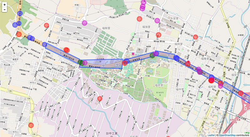 台中市公車即時動態資訊,藍色線為台灣大道,地圖上的圓點為公車,點擊後可以看到公車相關資訊,如車牌、時間及路線。而地圖上的點紅色為去程公車;紫色為回程路線的公車,點綠色為去程快捷公車;藍色為回程路線的快捷公車。