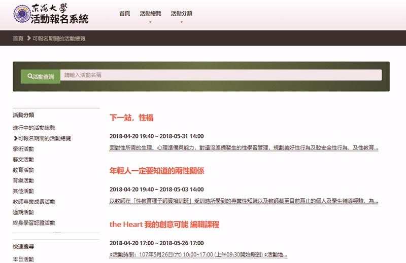為因應行動裝置普及化以及簡化校外人士報名流程、改善畫面呈現方式,整合後端平台,「活動報名系統」於104年12月全新改版上線,除了增修原有功能外,另新增QrCode及FB分享功能、學生與教職員查詢活動參與紀錄、後台管理介面簡化操作程序、上傳活動海報顯示於報名畫面、自訂報名資料設定必(選)填欄位等作業。105年5月系統再提供在無網路環境下仍然可以透過師生校園IC證卡進行活動簽到登錄,增加各單位活動名單彙整之效率。