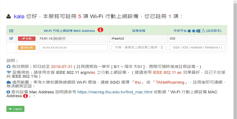 為了改善使用體驗與登入認證效率,電算中心於106學年度八月推出「東海大學校園無線網路Wi-Fi設備自助註冊服務」。