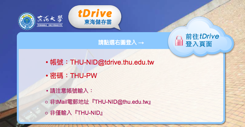 東海大學與微軟公司合作以專屬於東海之網域 tdrive.thu.edu.tw,構建微軟Office365之雲端儲存服務。